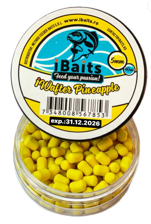 iBaits iWafter sunt momeli de tip wafters critic echilibrate, în formă de dumbell (butoiaș), cu diametrul de 5 mm și lungimea de 7 mm. Datorită capetelor rotunjite, montarea este extrem de rapidă și sigură pe fir de păr, bandă siliconică, quick stop sau spin de momeală.